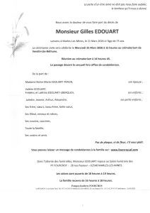 Nous présentons nos plus sincères condoléances à Frédéric Laetitia ainsi qu’à toute la famille pour le décès de Monsieur Édouard. Courage dans cette douloureuse épreuve. Nous serons présents avec vous par la pensée au moment des funérailles et vous assurons de toute notre sympathie. Martine et Martial SAUDEMONT.